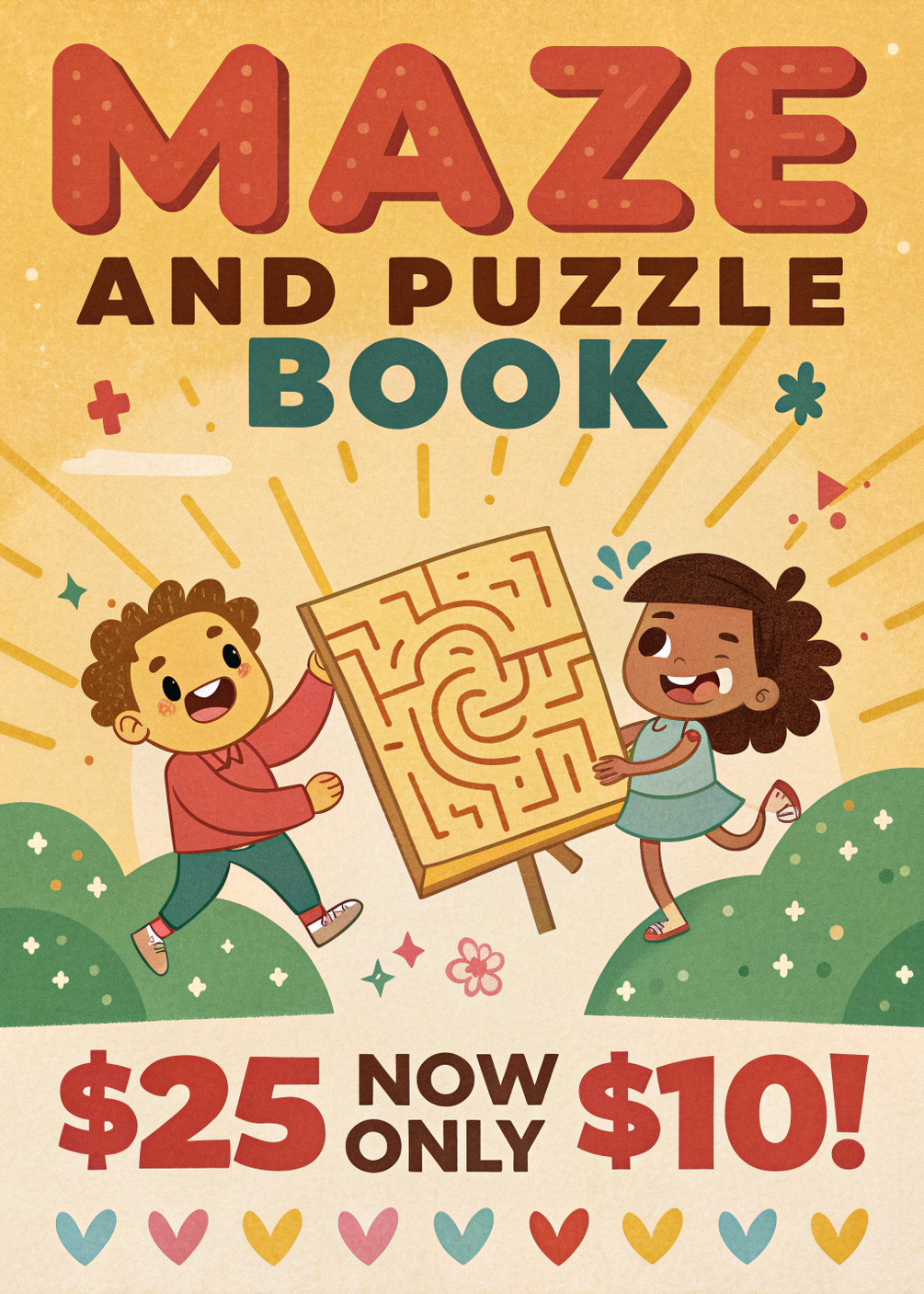 Discover the largest kids’ maze book available online! Packed with 200 pages of exciting mazes and solutions, this book is designed to boost your child’s creativity, problem-solving skills, and logical thinking. Inside, you’ll find 100 unique mazes of various difficulty levels, each followed by a complete solution for easy learning. Perfect for children of all ages, this smartly designed activity book offers endless hours of entertainment and education. Whether for home use, road trips, or as a special gift, it’s an unbeatable value at only $15 Give your child the fun and brain-training adventure they deserve – download it instantly and start the journey today!